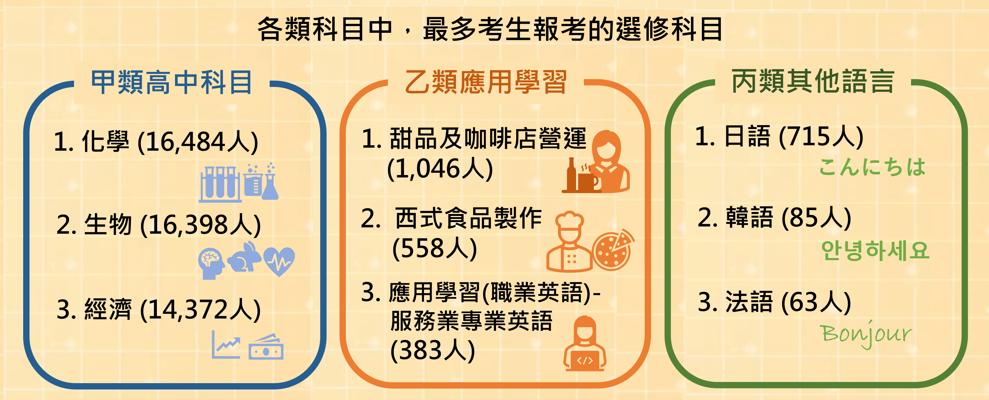 以下為2026年DSE三類科目中,最多人報考的選修科目。詳盡的報考統計資料可參閱考評局網頁。