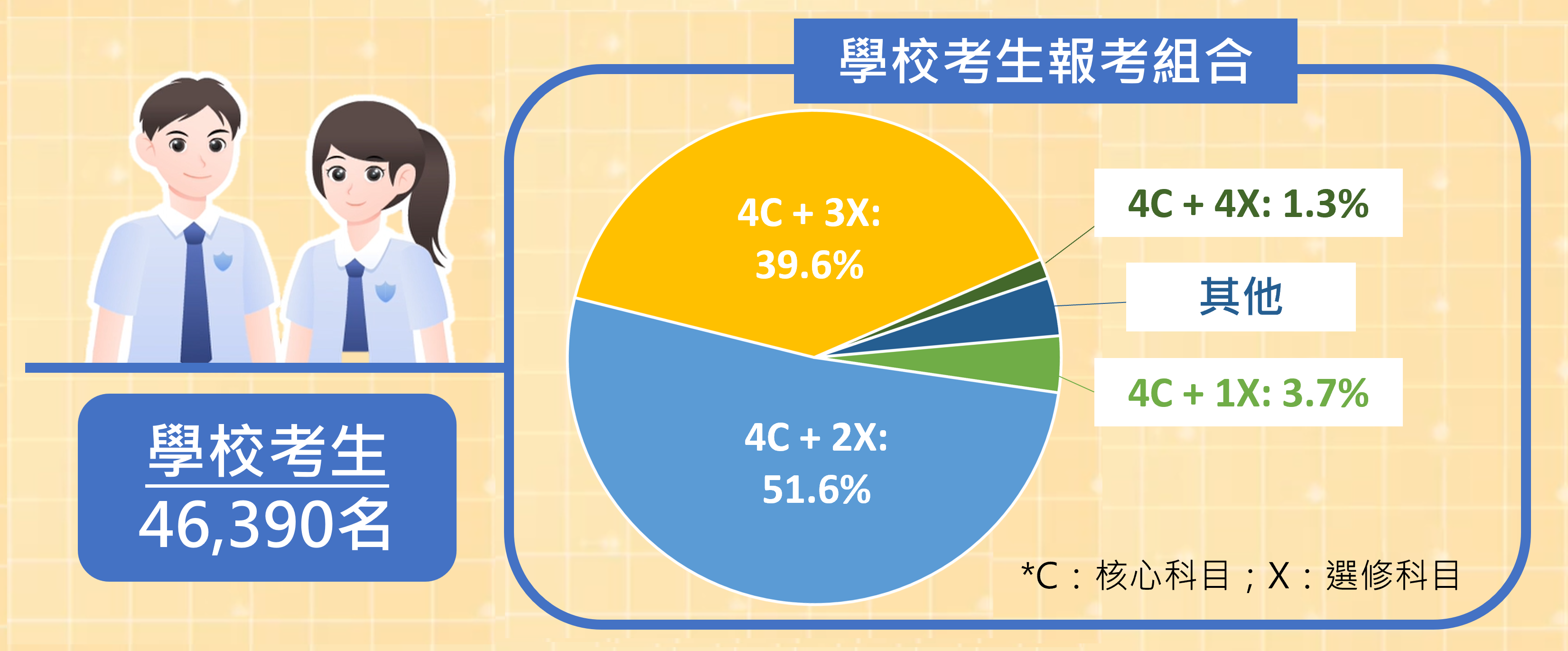 2026年DSE共有超過58,500人報考,較2025年同期增加近5%,當中約八成為學校考生。今年學校考生的報考科目組合,與2025年相若,近52%學校考生在四個核心科目以外,報考兩個選修科目,另有約40%考生報考三個選修科。